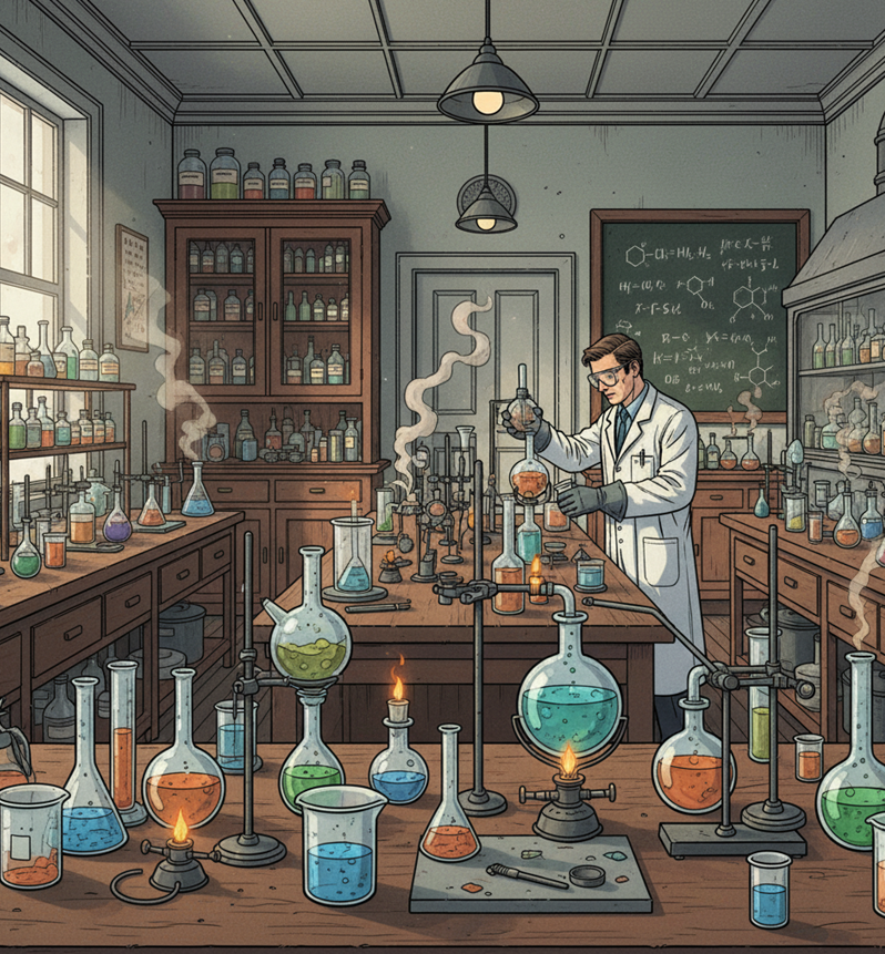 Ilmu kimia telah bertransisi dari praktik mistis alkimia ke disiplin ilmu kuantitatif yang ketat, membentuk pilar utama peradaban modern. Evolusi historisnya ditandai oleh pergeseran epistemologis, dipicu oleh penetapan metode ilmiah dan hukum dasar, seperti Hukum Kekekalan Massa oleh Antoine Lavoisier. Fondasi konseptualnya, yang berpusat pada stoikiometri dan struktur atom, kini menopang aplikasi vital dalam farmasi, energi, material maju, dan pertanian. Masa kini kimia diwarnai oleh respons sistemik terhadap tantangan keberlanjutan melalui revolusi Kimia Hijau , yang berfokus pada desain proses yang aman dan efisien. Sementara itu, frontier inovasi didominasi oleh konvergensi teknologi tinggi: Nanokimia, Kimia Supramolekul, dan Kecerdasan Buatan (AI). Konvergensi ini menjanjikan era Kimia Prediktif, yang mampu merancang material dan obat-obatan dengan presisi fungsional dan kecepatan R&D yang revolusioner. Laporan ini menyajikan analisis mendalam mengenai perjalanan transformatif ilmu kimia, implikasinya yang luas, dan arah strategis di masa depan.
