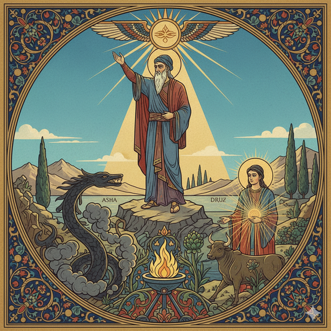Zoroastrianisme, yang berpusat pada pemujaan Ahura Mazda dan etika Pikiran Baik, Perkataan Baik, Perbuatan Baik, adalah agama dengan dualisme etis yang menuntut komitmen moral dan aksi nyata dari pengikutnya. Meskipun teologinya menghadapi ketegangan antara monoteisme yang ideal dan dualisme kosmik yang diperlukan—yang melahirkan sekte seperti Zurvanisme—Zoroastrianisme tetap optimis, menjanjikan kemenangan akhir kebaikan.