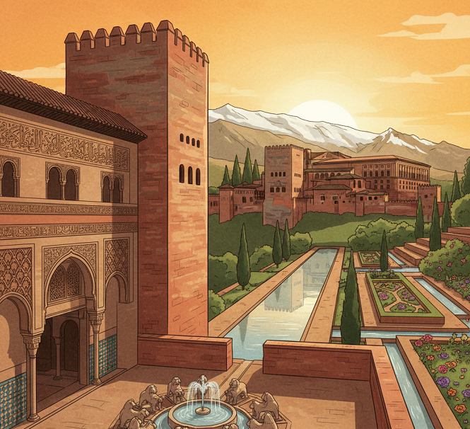 - Alhambra di Granada: Merupakan kesaksian terakhir dan puncak arsitektur Nasrid (abad ke-14). Alhambra terkenal karena kemewahan dekorasinya, termasuk penggunaan kubah muqarnas (struktur stalaktit) yang paling rumit dan canggih dalam sejarah arsitektur Islam.