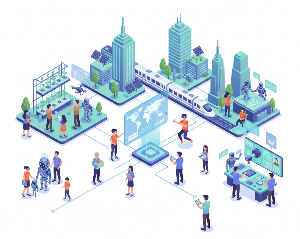 Teknologi AI, jaringan berkecepatan tinggi, dan telemedicine menjamin akses ke layanan kesehatan berkualitas dari mana saja. Misalnya, warga lanjut usia yang tinggal di daerah terpencil dapat melakukan pemeriksaan kesehatan rutin melalui telemedicine, dan jika terjadi penyakit mendadak, AI akan mendukung identifikasi dan pengangkutan ke rumah sakit yang paling tepat. Inovasi ini, yang didukung oleh digitalisasi atribut fisik individu dan kemajuan bioteknologi, memungkinkan manajemen kesehatan yang aktif selama siklus hidup, bahkan dalam skenario bencana, di mana layanan medis tetap dapat dipertahankan, terutama di daerah dengan infrastruktur yang rentan.