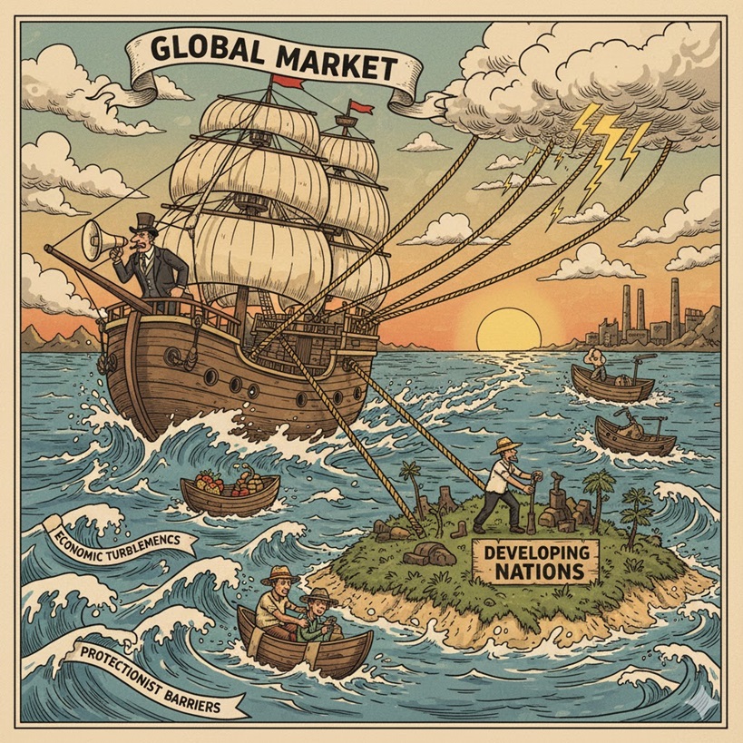 Negara-negara berkembang (NGB) menghadapi lanskap pasar global yang ditandai oleh dualitas fundamental: janji liberalisasi yang stabil, yang diwakili oleh institusi multilateral, berhadapan dengan realitas proteksionisme tersembunyi, dominasi standar baru, dan asimetri kapasitas domestik. Kelompok NGB sendiri sangat heterogen, mencakup negara Least Developed hingga ekonomi pasar menengah yang sedang bangkit (misalnya, Indonesia), namun mereka berbagi kerentanan bersama terhadap guncangan eksternal dan keterbatasan struktural internal.