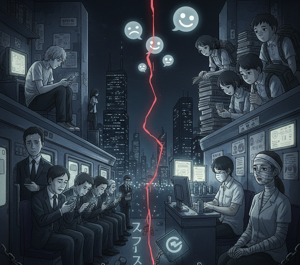 Perbedaan muncul dalam cara manajemen patologi sosial. Jepang menghadapi krisis mental melalui stigma dan isolasi, di mana Haji mendorong penyembunyian penyakit mental dan penanganan terfokus pada institusionalisasi. Sebaliknya, Korea Selatan menghadapi tekanan mental melalui kelelahan kronis, akibat jam kerja yang berlebihan dan persaingan yang tiada henti di sekolah dan tempat kerja.