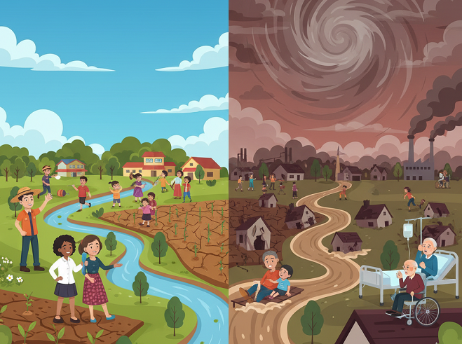 Krisis ini secara langsung menyebabkan kurangnya layanan pendidikan dan perlindungan sosial, serta memperburuk kemiskinan. Komunitas rentan menghadapi berbagai ancaman fisik secara simultan, termasuk siklon, banjir sungai, banjir rob, kelangkaan air, dan peningkatan penyakit, yang diperparah oleh polusi udara, tanah, dan air. Skala ancaman ini menuntut perhatian mendesak, khususnya bagi Negara-Negara Berkembang Pulau Kecil (Small Island Developing States – SIDS) dan wilayah kering/semi-kering, seperti kawasan Sahel di Afrika.