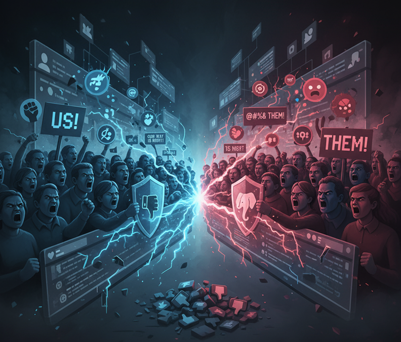 Polarisasi politik di media sosial lintas negara adalah hasil dari konvergensi antara bias desain algoritmik dan faktor sosio-politik endogen. Algoritma media sosial telah bergeser dari sekadar medium menjadi “aktor tersendiri” yang secara aktif membentuk dan mensegmentasi opini publik. Algoritma ini mengeksploitasi bias psikologis (negativity bias) dan insentif ekonomi (engagement rate) untuk menciptakan filter bubble yang memperkuat keyakinan ekstrem dan radikalisasi identitas politik, yang pada akhirnya berkontribusi pada krisis kepercayaan institusi demokrasi.