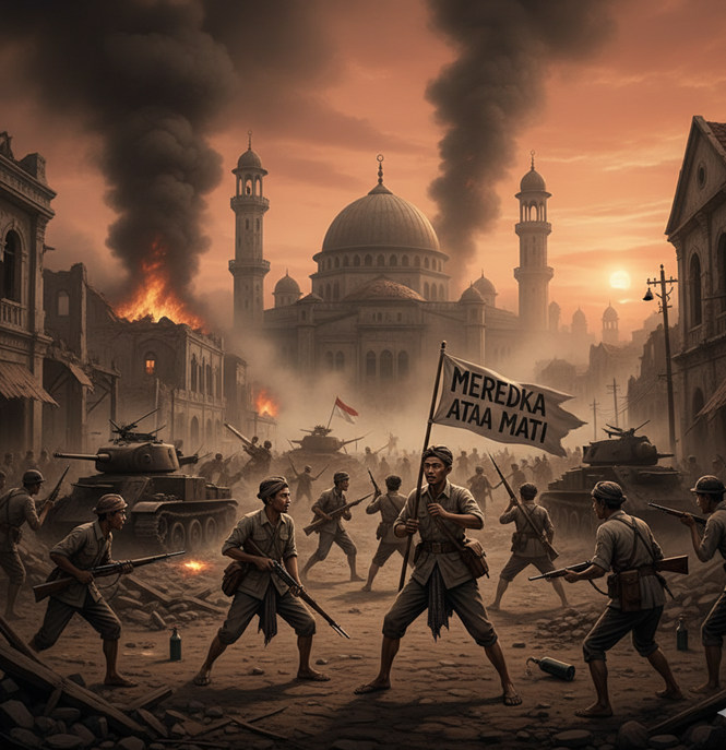 Pertempuran Surabaya pada 10 November 1945 merupakan titik balik psikologis dan politis dalam Revolusi Nasional Indonesia. Konflik ini berakar dari kontradiksi mendasar antara mandat Sekutu yang sempit dan agenda politik tersembunyi untuk mengembalikan kekuasaan Belanda, yang segera memicu reaksi keras dari rakyat yang telah menegaskan kedaulatannya.