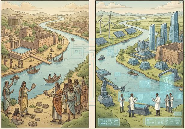 Lebih luas lagi, kedua peradaban ini menunjukkan bagaimana masyarakat yang sangat bergantung pada pola iklim dan hidrologi yang stabil gagal beradaptasi dengan perubahan yang cepat. Kekuatan adaptif peradaban sangat bergantung pada kapasitasnya untuk mengelola kerentanan internal (seperti tekanan demografis dan konflik) sebelum menghadapi krisis eksternal (seperti kekeringan atau kegagalan sungai). Kegagalan untuk menjaga legitimasi politik dan mengelola sumber daya lingkungan secara berkelanjutan dapat mengubah perubahan iklim menjadi bencana sistemik yang cepat.