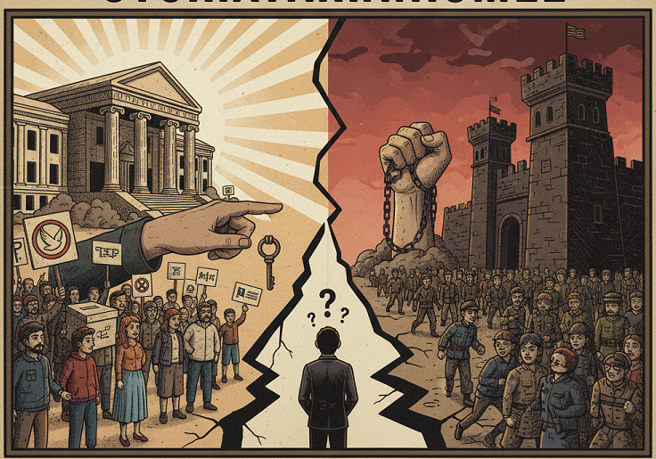 | Tantangan Internal | Polarisasi, Dominasi Eksekutif, Kemunduran Kebebasan Sipil (Backsliding) , Kritik terhadap Hipokrisi Kapitalis. | Kontrol Total atas Pers dan Ruang Digital (Instrumen Represif Hukum) , Manipulasi Opini Publik (Buzzer). |