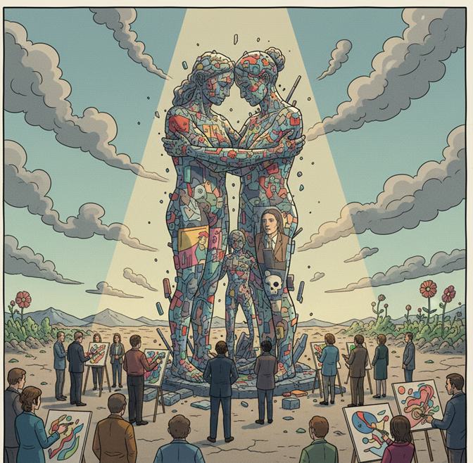 Seni, sebagai proyek sosial, melengkapi proyek hukum TJ. Di banyak negara pasca-genosida, pasca-diktator, atau pasca-perang saudara, rekonsiliasi membutuhkan narasi bersama yang tidak dapat dipaksakan oleh undang-undang. Seni menyediakan ruang simbolik di mana masyarakat merenungkan luka, bersalah, dan pilihan-pilihan manusia yang rapuh. Justru dengan menggambarkan rekonsiliasi—meskipun melalui jalan yang pahit—seni menawarkan pertanyaan penting dan menyalurkan trauma menjadi alat pembelajaran kolektif, tanpa memutus percakapan-percakapan esensial tentang kemanusiaan.