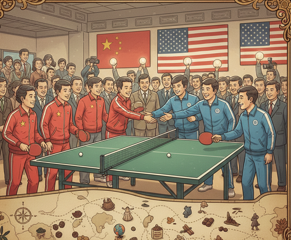 Kejuaraan Tenis Meja Dunia ke-31 yang diadakan di Nagoya, Jepang, pada April 1971, menjadi panggung bagi diplomasi yang tidak terduga. Meskipun terdapat perlawanan dari kelompok garis keras di Beijing, Mao Zedong secara pribadi menyetujui keikutsertaan tim Tiongkok dalam turnamen tersebut dengan instruksi spesifik dari Perdana Menteri Zhou Enlai: “Utamakan persahabatan, kompetisi nomor dua”. Di Nagoya, para atlet Tiongkok diingatkan secara ketat untuk tidak memulai percakapan dengan atlet Amerika, namun juga dilarang bersikap kasar jika diajak bicara.