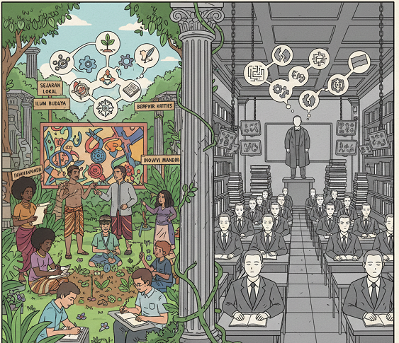 Kurikulum Padat Fokus pada ujian standar yang mengabaikan kearifan lokal. Integrasi interdisipliner pengetahuan adat ke dalam subjek inti.