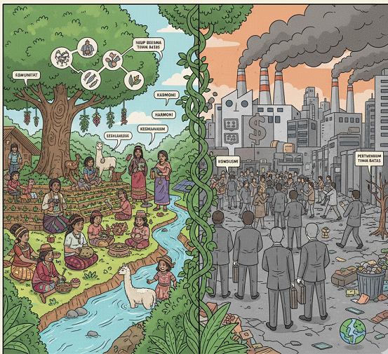 | Peran Alam | Sumber daya untuk dieksploitasi (komoditas). | Subjek hak yang harus dihormati (Pachamama). |