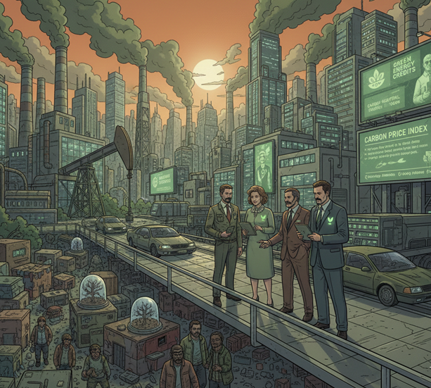 Kapitalisme karbon adalah perpanjangan dari logika ini. Alih-alih menghentikan aktivitas yang menyebabkan bencana, sistem ini menciptakan pasar baru di mana bencana itu sendiri menjadi pendorong keuntungan melalui perdagangan hak polusi dan instrumen derivatif keuangan lainnya. Kegagalan sistemik untuk menurunkan emisi justru menciptakan permintaan yang lebih tinggi untuk kredit karbon dan jasa konsultasi adaptasi, menciptakan siklus di mana kegagalan ekologis menjadi bahan bakar bagi pertumbuhan modal.