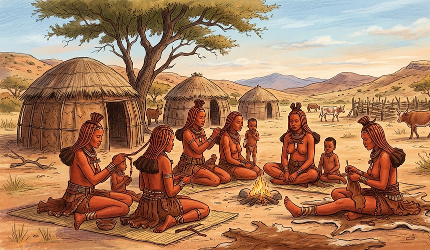 Namun, bagi wanita Himba, otjize jauh melampaui sekadar perlindungan fisik. Warna merah dari pasta tersebut melambangkan dua elemen fundamental dalam kosmologi mereka: tanah (bumi) dan darah (kehidupan). Tanah dianggap sebagai sumber eksistensi dan tempat bersemayamnya roh-roh leluhur, sementara darah adalah esensi fertilitas dan kekuatan hidup. Dengan menyelimuti tubuh mereka dalam warna merah, wanita Himba melakukan tindakan ritualistik untuk menyatukan diri mereka dengan alam semesta dan garis keturunan leluhur mereka. Estetika dalam konteks ini menjadi sebuah ontologi—sebuah cara untuk “menjadi” dan “ada” di dalam tanah air mereka.