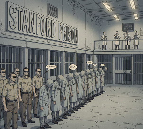 | Deindividuasi | Kehilangan identitas pribadi karena seragam dan peran. | Penjaga bertindak tanpa rasa tanggung jawab individu. |