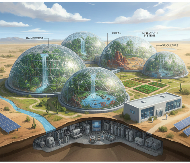 Visi proyek ini sangat luas: melampaui sekadar simulasi ruang angkasa, ia dimaksudkan sebagai “Bahtera Nuh” modern untuk menyelamatkan keanekaragaman hayati Bumi dari ancaman bencana ekologis global. Arsitektur bangunan yang menggabungkan bentuk piramida Maya dengan kubah geodesik putih mencerminkan ambisi untuk menyatukan masa lalu manusia dengan masa depan teknologi.