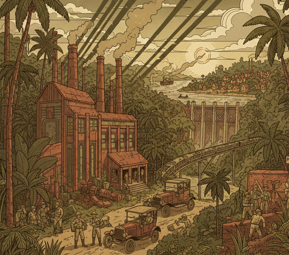 4. Dampak Ekologis Jangka Panjang: Fordlândia menjadi preseden bagi model pembukaan lahan skala besar di Amazon. Teknik “babat dan bakar” yang diperkenalkan Ford untuk industri karet kini menjadi metode standar bagi ekspansi kedelai dan peternakan sapi yang mengancam keanekaragaman hayati Amazon secara global.