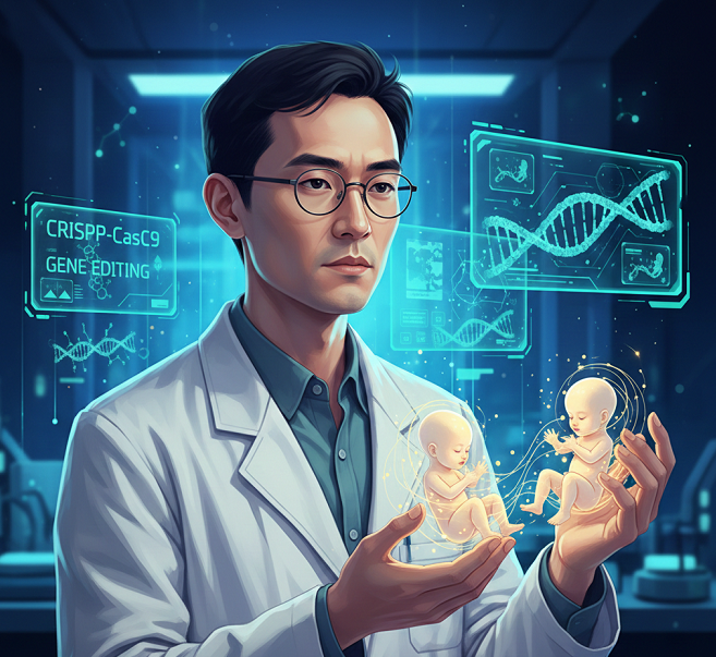 Sistem $CRISPR-Cas9$ ($Clustered\ Regularly\ Interspaced\ Short\ Palindromic\ Repeats$), yang sering digambarkan sebagai “gunting genetik,” memungkinkan para ilmuwan untuk memotong dan mengubah urutan DNA dengan tingkat presisi yang sebelumnya tidak terbayangkan. Penemuan ini, yang dipelopori oleh Jennifer Doudna dan Emmanuelle Charpentier pada tahun 2012, awalnya ditujukan untuk terapi somatik—penyuntingan sel-sel tubuh yang tidak diwariskan kepada keturunan. Namun, He Jiankui, yang memiliki latar belakang pendidikan di institusi elit Amerika Serikat seperti Rice University dan Stanford University, melampaui batas ini dengan menargetkan embrio pada tahap satu sel.