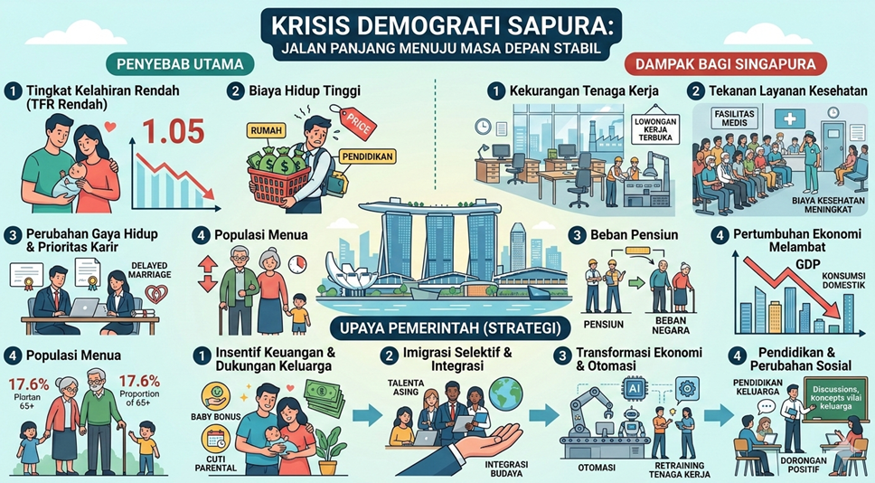 Singapura sedang menghadapi fenomena penuaan populasi yang sangat cepat. Pada tahun 2025, sekitar satu dari lima warga negara Singapura berusia 65 tahun ke atas, meningkat pesat dari satu banding delapan hanya satu dekade sebelumnya. Dengan hanya sekitar 27.500 kelahiran residen pada tahun 2025—angka terendah yang pernah tercatat—Singapura menghadapi risiko kekurangan tenaga kerja lokal yang parah dan pelemahan struktur pendukung keluarga.