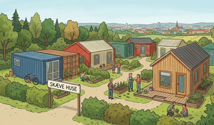 Sejarah Skaeve Huse (secara harfiah berarti “Rumah Miring”) bermula dari sebuah penelitian di Denmark pada tahun 1993 yang mengamati komunitas marginal di Kopenhagen. Penelitian tersebut mengidentifikasi adanya kelompok “individualis perkotaan”—individu yang tidak mampu atau tidak mau beradaptasi dengan norma-norma kehidupan bertetangga yang konvensional namun tetap membutuhkan perlindungan hukum berupa hunian permanen. Pemerintah Denmark meresmikan konsep ini pada periode 1999-2003 dengan menyediakan pendanaan bagi proyek-proyek perumahan bagi mereka yang berada di pinggiran masyarakat.